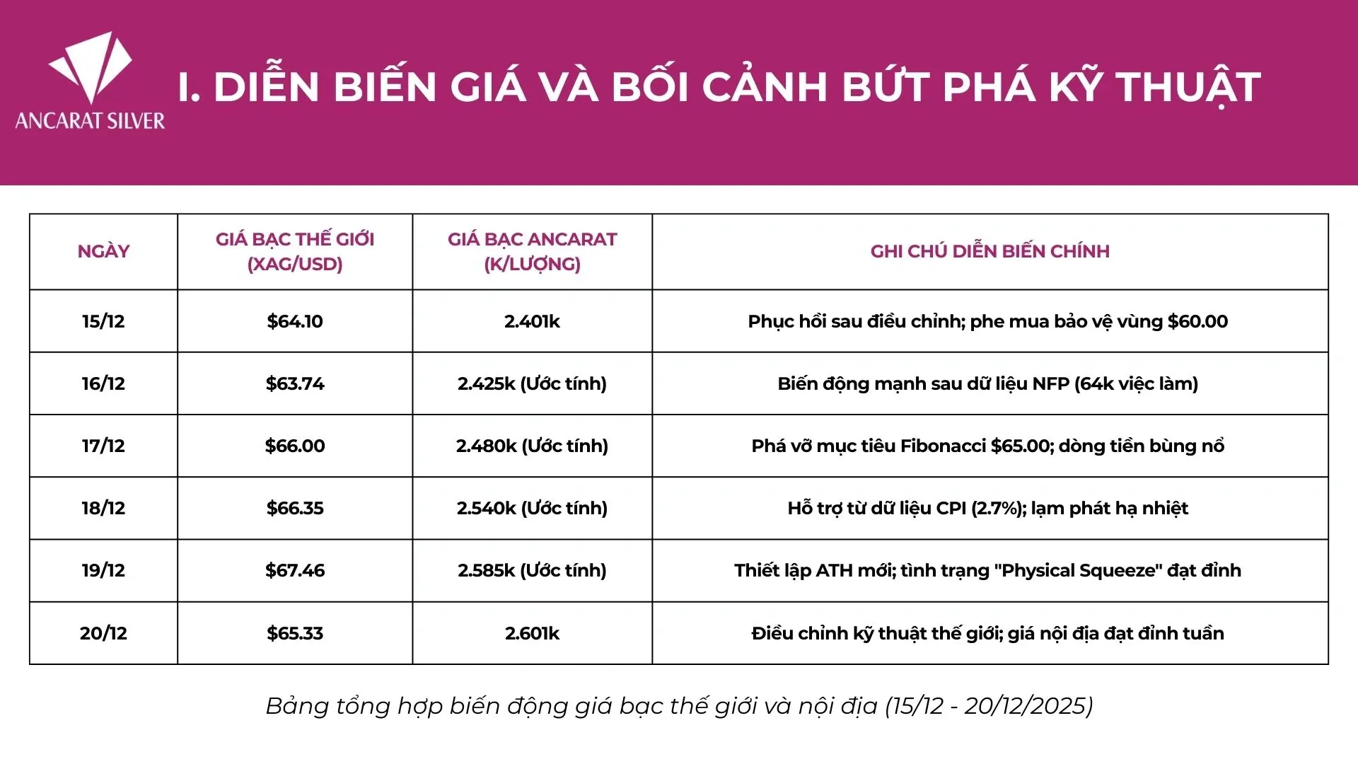 - Bứt phá ATH: Ngày 19/12, giá bạc thế giới thiết lập đỉnh cao mọi thời đại (ATH) tại $67.46/ounce.