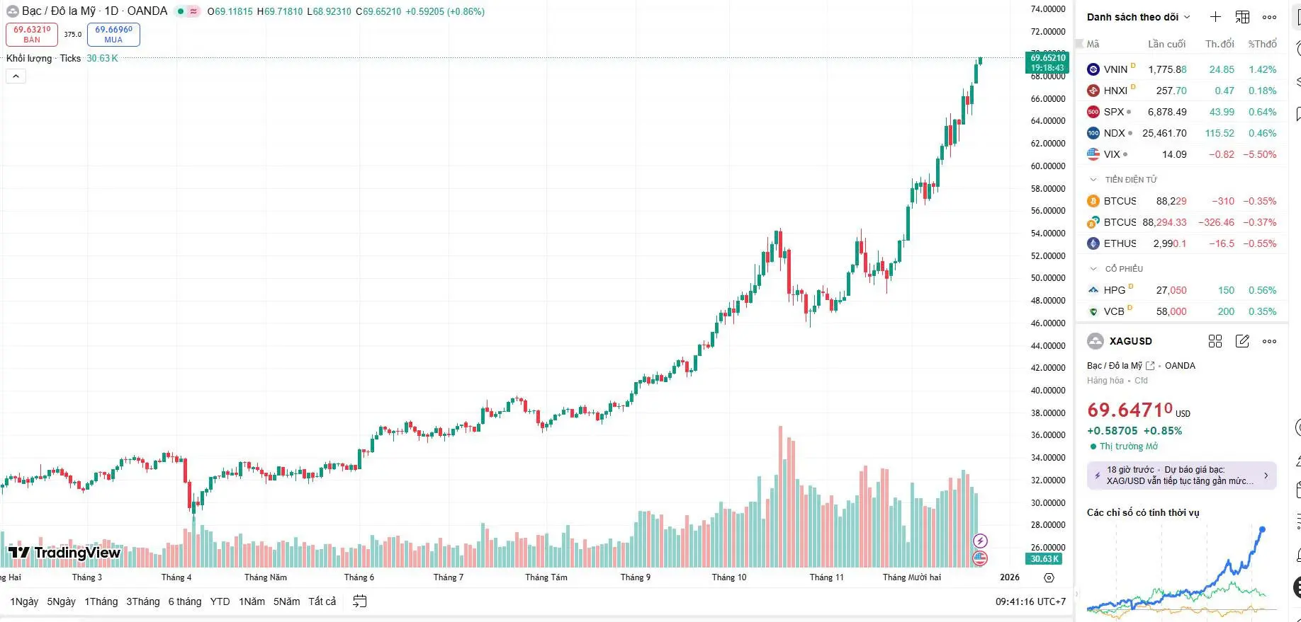 Nhìn vào biểu đồ kỹ thuật XAG/USD, giá bạc thế giới đang giao dịch quanh mốc 69.49 USD, giữ vững sắc xanh tăng trưởng +0.63%. Xu hướng nến ngày (1D) cho thấy đà tăng dốc đứng, chưa có dấu hiệu hạ nhiệt. Điều này khẳng định giá bạc Ancarat trong nước vẫn còn dư địa tăng trưởng rất lớn, và mức giá 2,849,000 VNĐ hiện tại có thể là mức giá "đáy" trước khi bước vào chu kỳ tăng giá mới của năm 2026.